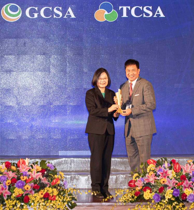 友達(dá)勇奪臺(tái)灣永續(xù)企業(yè)獎(jiǎng) 13 項(xiàng)大獎(jiǎng) ,由總統(tǒng)蔡英文頒獎(jiǎng) (左),友達(dá)董事長彭雙浪 (右) 代表領(lǐng)獎(jiǎng)