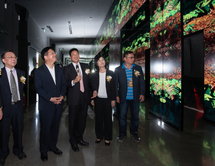 友達微美館以大自然實景拍攝結合電腦動畫的壯闊影片 ,讓觀眾仿佛身歷其境感受植物的生命旅程 (左一:國立臺灣博物館館長洪世佑、左二 :臺中市市長林佳龍、左三 :友達光電董事長暨執(zhí)行長彭雙浪)