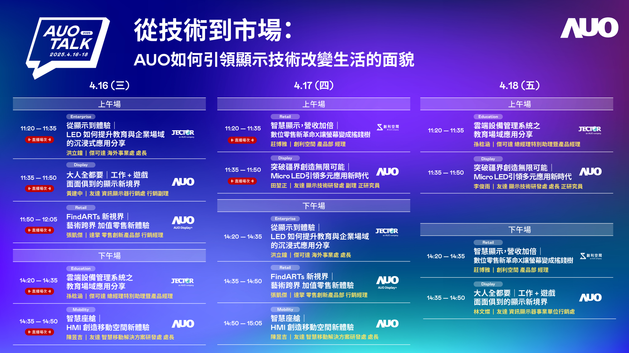 友達(dá)持續(xù)深化拓展垂直場域,並延伸建構(gòu)價(jià)值鏈,打造共創(chuàng)、共榮的智慧場域生態(tài)圈。Touch Taiwan 2025展覽期間,友達(dá)展區(qū)將舉辦2025 AUO Talk,匯集旗下子公司華麗陣容,針對(duì)7大主題及相關(guān)成功案例進(jìn)行專題演講,分享突破疆界創(chuàng)造無限可能|Micro LED引領(lǐng)多元應(yīng)用新時(shí)代、FindARTs新視界|藝術(shù)跨界.永續(xù)體驗(yàn),以及智慧顯示、營收加倍|數(shù)位零售新革命X讓螢?zāi)蛔兂蓳u錢樹等豐富內(nèi)容,為展覽訪客演譯友達(dá)賦能智慧場域新生態(tài),引領(lǐng)顯示技術(shù)改變生活的嶄新面貌。